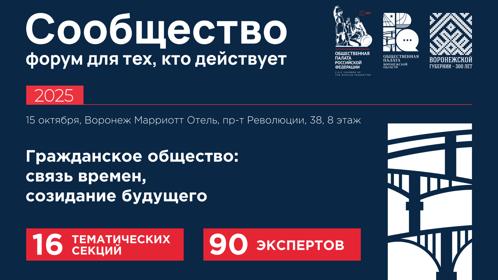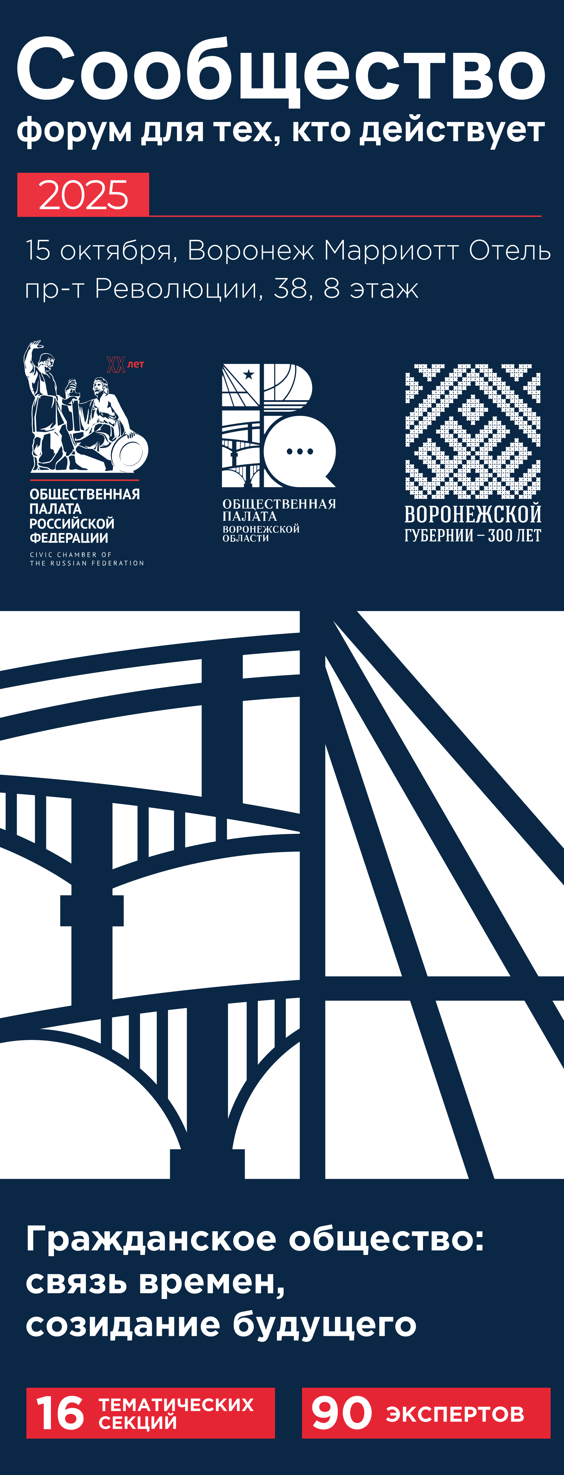 Форум «Сообщество» — это открытая площадка для трехстороннего диалога между властью, бизнесом и обществом. Цель — повышение качества разработки и реализации социальных проектов и развития межсекторных проектов. Традиционно форум проводит Общественная палата РФ в разных округах страны совместно с местными отделениями, чтобы оценить состояние гражданского общества и обсудить актуальные вопросы с учетом региональной специфики. Приглашаю вас присоединится к форуму в Воронеже, чтобы вместе определить и масштабировать лучшие социально ориентированные практики в нашем регионе.